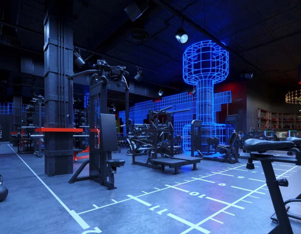 Открывает пространство зала просторная лаунж-зона, напоминающая ресепшн пяти звёздочного европейского отеля. Далее разворачивается футуристический зал, разделенный на зоны световыми инсталляциями. Красная ковровая дорожка ведет в просторную раздевалку с душевыми, выполненными из метала и мрамора.